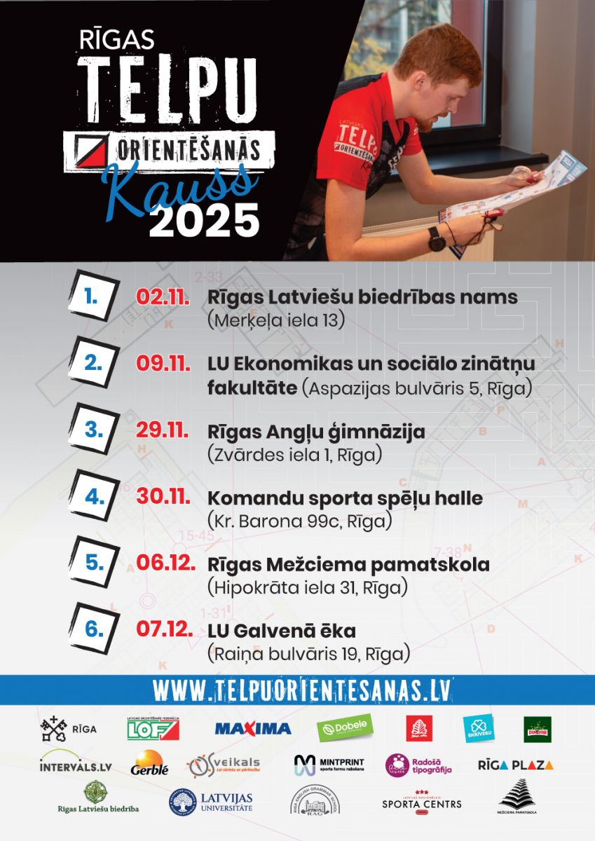 Šogad Rīgas Telpu orientēšanās kauss norisināsies 6. posmos no 2. novembra līdz 7. decembrim: