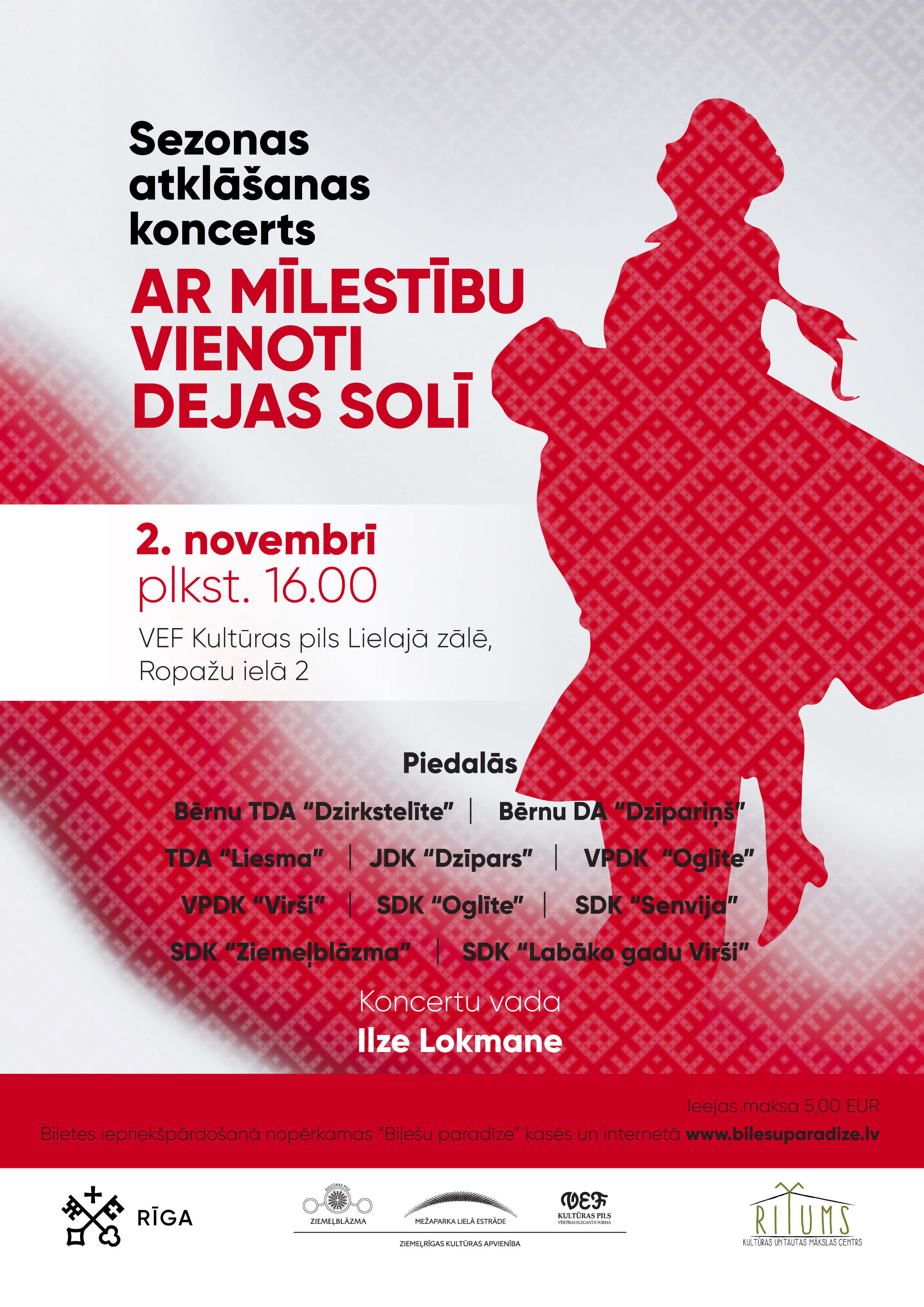 Koncertā piedalās deju kolektīvi “Zalktis” un “Skabardzēni”. Biļetes cena 10.00 EUR.